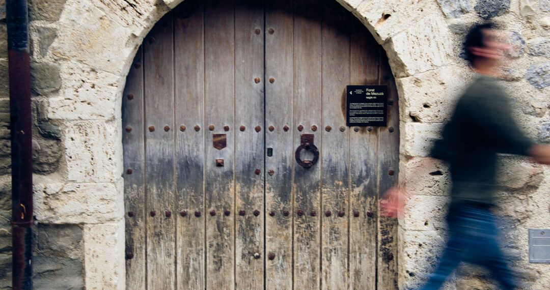 דן ונועה חוצים את קשתו המונומנטלית של שער הרובע המבוצר וחודרים אליו דרך רחובותיו, כמי שנכנסו אל תוך מכונת זמן. אט-אט, מבלי לפספס שום פרט, הם מתקדמים לעבר כיכר ליברטאד שבה, על פי התיעוד, יושבו סכסוכים בין יהודים לנוצרים. אחר שהייה קצרה תחת הקשת, הם פונים שמאלה דרך סמטת פורטלאת (Portalet) מרוצפת האבן, המחזירה אותם בחזרה לעבר הנהר. שם, מתחת לקשת בראשית הרחוב, הם עושים את תמונתם הראשונה בטיולם אל העבר.